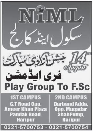 Admissions in Institute of Modern Language NIML 2025 for Playgroup to FSC has been announced. Eligible students who qualify as per admission criteria in Institute of Modern Language NIML Haripur Khyber Pakhtunkhwa KPK Pakistan can apply in Science College for academic year 2025. Eligible candidates for admissions in can apply as per Government institute criteria and before closing date after reading advertisement online. Read newspaper ad for exact details.