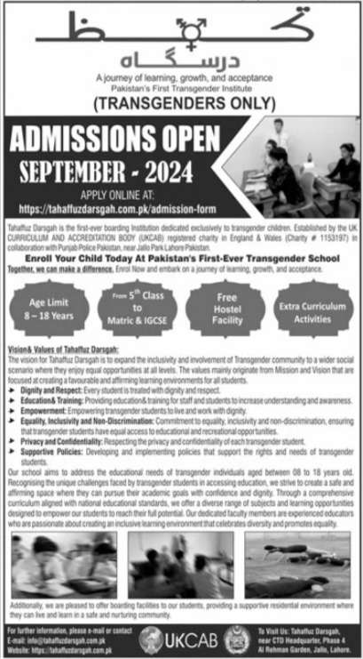 Admissions in Tahaffuz Darsgah 2024 for Playgroup to Intermediate Classes has been announced. Tahaffuz Darsgah Lahore Punjab Pakistan welcomes students to apply for admissions in academic year 2024 in Science College. Eligible candidates for admissions in Primary, Middle, Matric and Intermediate can apply as per Private institute criteria and before closing date 15 July 2024 after reading advertisement online. Read newspaper ad for exact details.