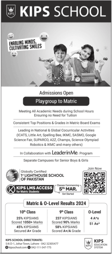 Kips collage admissions 2025 for Playgroup to Matric has been announced. Eligible students who qualify as per admission criteria in Kips collage Lahore Punjab Pakistan can apply in Science School for academic year 2025. Eligible candidates for admissions in can apply as per Private institute criteria and before closing date after reading advertisement online. Read newspaper ad for exact details.