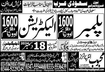 Vacant posts including electrician and plumber are announced in Mehboob Enterprises Overseas Employment Promoters Riyadh, riyadh Saudi Arabia as per 17 December 2024 advertisement in daily Express Newspaper. Preferred Education is Middle etc.