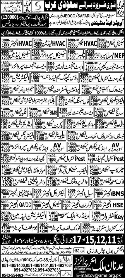 Adnan Malik Enterprises invites applications for job positions advertised in daily Express dated 10 July 2023 for following vacancies in Riyadh, riyadh Saudi Arabia.