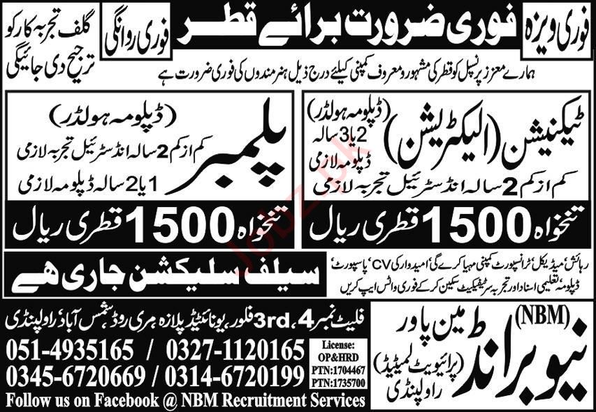 Vacant posts including plumber and technician are announced in New Brand Manpower Qatar, qatar Qatar as per 22 October 2023 advertisement in daily Express Newspaper. Preferred Education is Matric and DAE etc.