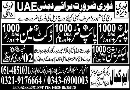 M Kamal Recruitment Services invites applications for job positions advertised in daily Express dated 31 January 2023 for following vacancies in Abu Dhabi, dubai UAE.