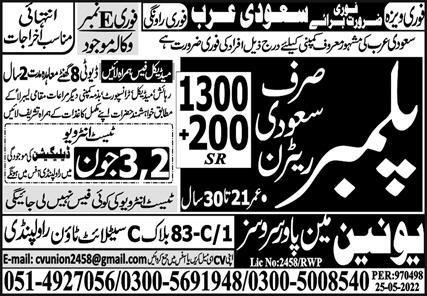 Union Manpower Services is looking for candidates for following posts as per job advertisement published in daily Express Newspaper of June 1, 2022 for location Makkah, makkah Saudi Arabia: