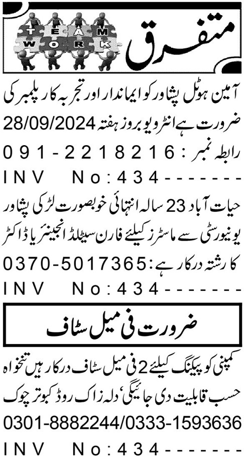 Private Company Peshawar, peshawar Khyber Pakhtunkhwa KPK Pakistan invites applications from eligible candidates for the post of packer, packing staff and plumber as per advertisement of September 27, 2024 published in daily Aaj Newspaper. Persons with Matric and Middle etc. education can apply.