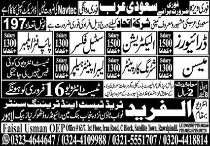 Al Fareed Trade Test and Technical Training Center jobs advertisement dated about 12 February 2025 in daily Express Newspaper invites application for the vacant post of pipe fitter, driver, steel fixer, labor, mason, painter helper, shuttering carpenter, electrician and plumber in Riyadh, dammam Saudi Arabia. Middle, Matric and Intermediate etc. educational qualification will be preferred.