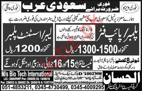 Latest Bio Tech International Overseas Promoter & Human Resource Development Labor Posts Saudi Arabia 2025