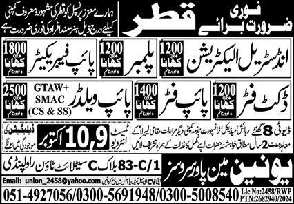 Union Manpower Services Doha, doha Qatar invites applications from eligible candidates for the post of pipe fitter, welder, smaw welder, pipe fabricator, industrial electrician, pipe welder, plumber, duct fitter and gtaw welder as per advertisement of October 9, 2024 published in daily Express Newspaper. DAE, Intermediate, Matric and Bachelor etc. educational qualification will be preferred.