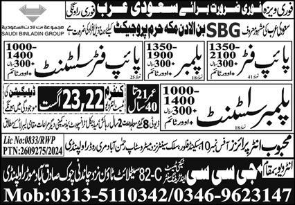 GCC Techni Test & Training Center Madina, makkah Saudi Arabia invites applications from eligible candidates for the post of plumber assistant, plumber, pipe fitter assistant and pipe fitter as per advertisement of August 20, 2024 published in daily Express Newspaper. Preferred Education is Intermediate and Matric etc.