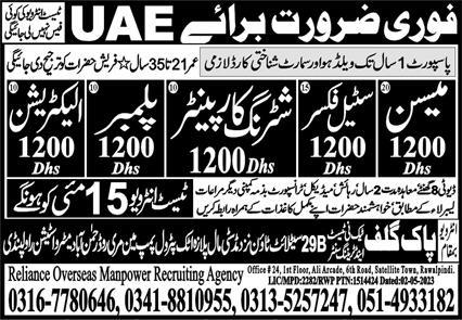 Reliance Overseas Employment Promoters Abu Dhabi, sharjah UAE invites applications from eligible candidates for the post of shuttering carpenter, steel fixer, mason, electrician and plumber as per advertisement of May 11, 2023 published in daily Express Newspaper. Educational qualifications required Matric and Intermediate etc.