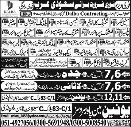 Union Manpower Services invites applications for job positions advertised in daily Express dated 6 August 2024 for following vacancies in Dammam, makkah Saudi Arabia.