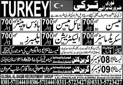 Green Line Human Trade Test invites applications for job positions advertised in daily Express dated 8 November 2025 for following vacancies in Istanbul, ankara Turkey.