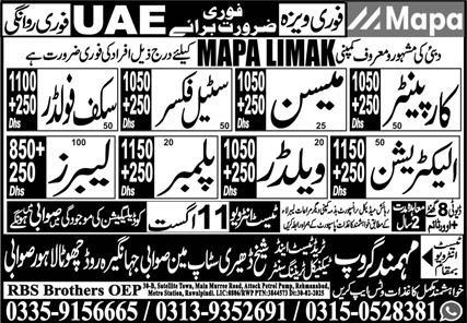 Mohmand Group Trade Test & Technical Training Center invites applications for job positions advertised in daily Express dated 9 August 2025 for following vacancies in Abu Dhabi, sharjah UAE.