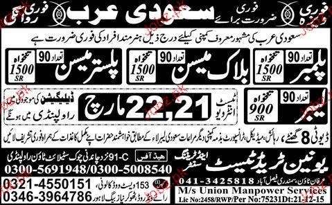 Plumbers, Block Mason, Plaster Mason Job Opportunity