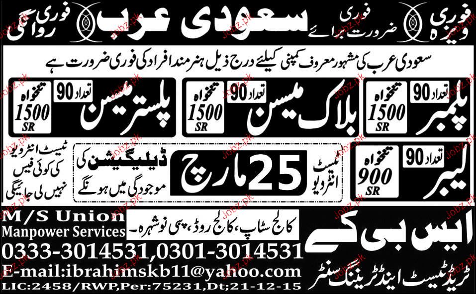 Plumbers, Block Mason, Plaster Mason Job Opportunity