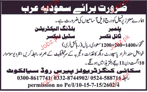 Plumbers, Building Electricians, Tile Fixers Job Opportunity