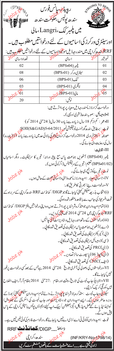 Plumbers, Sanitary Workers, Cook Job In Sindh Police