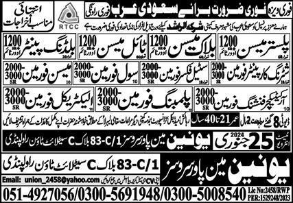 Vacant posts including mason foreman, plaster mason, electrical foreman, steel fixer foreman, shuttering carpenter foreman, block mason, mason, building painter, plumbing foreman, architecture finishing foreman, tile mason and civil foreman are announced in Union Manpower Services Dammam, riyadh Saudi Arabia as per 24 January 2024 advertisement in daily Express Newspaper. Preferred Education is DAE, Matric, Bachelor and Intermediate etc.
