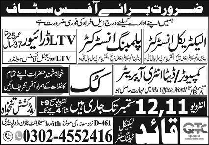 Quaid Technical Training Center Satellite Town - 6th Road Rawalpindi, rawalpindi Punjab Pakistan invites applications from eligible candidates for the post of cook, ltv driver, computer operator, plumbing instructor, electrical instructor, driver and data entry operator as per advertisement of September 11, 2025 published in daily Express Newspaper. Candidates with Middle, Intermediate, Bachelor and Matric etc. educational background will be preferred.
