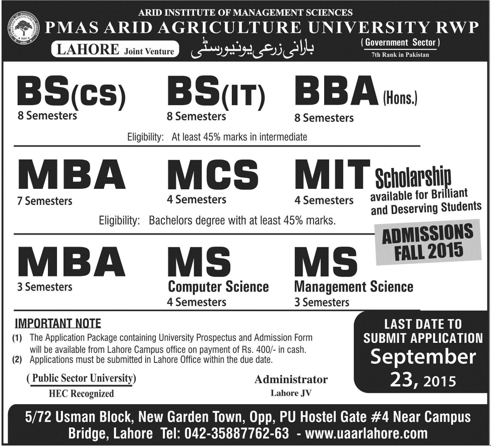 PMAS Arid Agriculture University Admission in BS, MBA, MCS and MIT in Rawalpindi. Read newspaper ad for exact details.