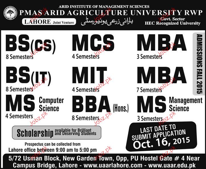 PMAS Arid Agriculture University Admission in BBA, BS, BSc, BFA, B.Com, MA, MSC, MBA, MCs and M.Com in Rawalpindi. Read newspaper ad for exact details.