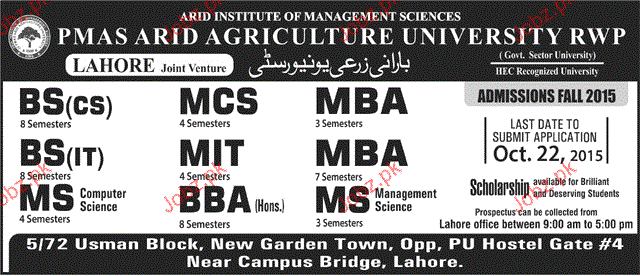 PMAS Arid Agriculture University Admission in LLB, BBA, BS, MBA and MCS in Lahore. Read newspaper ad for exact details.