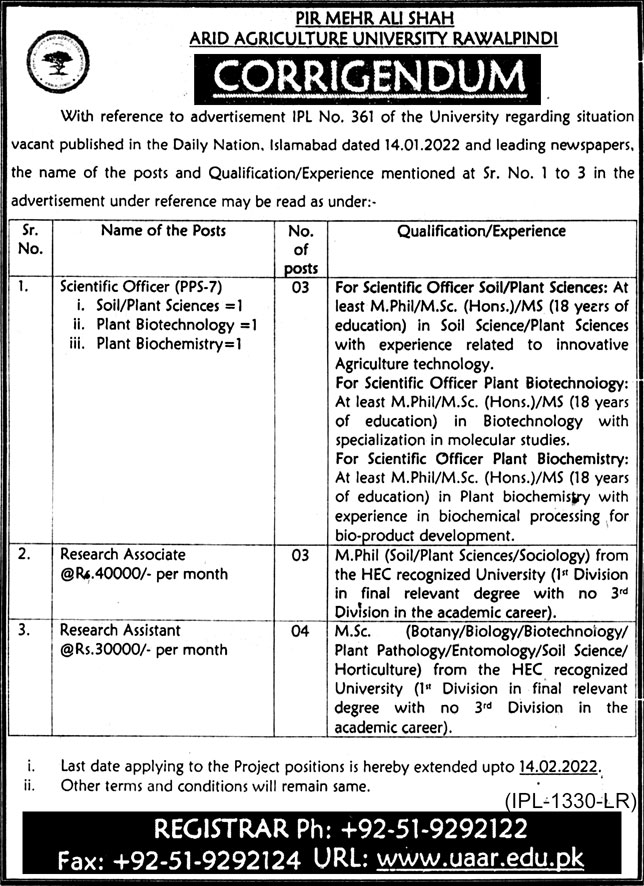 Pir Mehr Ali Shah Arid Agriculture University UAAR is looking for candidates for following posts as per job advertisement published in daily Nation Newspaper of February 6, 2022 for location Rawalpindi Punjab Pakistan: