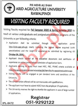 Vacancies in Pir Mehr Ali Shah Arid Agriculture University UAAR Advertisement October 2020