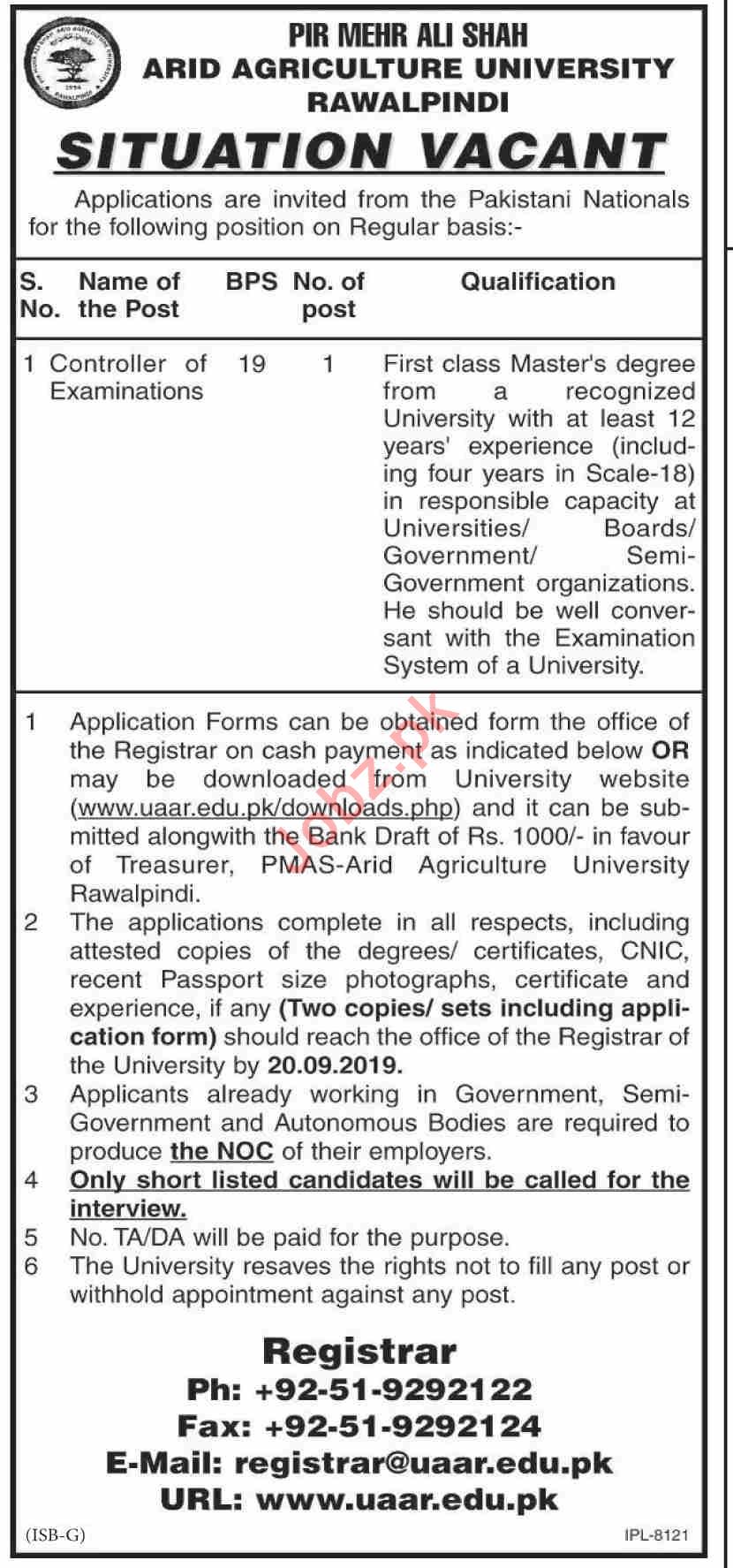 Vacancies in Pir Mehr Ali Shah Arid Agriculture University UAAR Advertisement September 2019