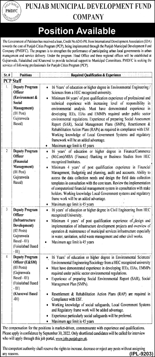 Punjab Municipal Development Fund Company PMDFC jobs advertisement dated about 16 September 2022 in daily Nawaiwaqt Newspaper invites application for the vacant post of deputy program officer environmental social management, deputy program officer infrastructure development, deputy program officer financial management, deputy program officer and deputy program officer esm in Lahore, lahore Punjab Pakistan. MS, Master, M.com and MBA etc. educational qualification will be preferred.