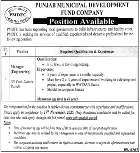 Punjab Municipal Development Fund Company PMDFC is looking for candidates for following posts as per job advertisement published in daily Jang Newspaper of November 3, 2025 for location Lahore, lahore Punjab Pakistan: