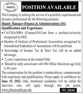Punjab Municipal Development Fund Company PMDFC Lahore, lahore Punjab Pakistan invites applications from eligible candidates for the post of deputy manager director finance, deputy accounts manager and deputy manager administration as per advertisement of June 5, 2022 published in daily The News Newspaper. Preferred Education is CA and MBA etc.