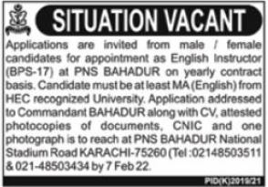 PNS Bahadur jobs advertisement dated about 20 January 2022 in daily Nation Newspaper invites application for the vacant post of english instructor and instructor in Karachi Sindh Pakistan. Candidates with MA and Others etc. educational background will be preferred.