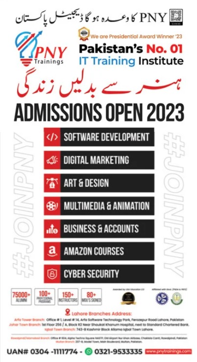 PNY Trainings IT Courses of Software Development, Digital Marketing, Art & Design, Multimedia & Animation, Business & Accounts, Amazon Courses, Cyber Security admissions 2023 has been announced. Students who want to take admissions in PNY Trainings Lahore Punjab Pakistan for academic year 2023 to continue education in IT Course can apply. Eligible candidates for admissions in Course and Diploma can apply as per Private institute criteria and before closing date 16 August 2023 after reading advertisement online. Read newspaper ad for exact details.
