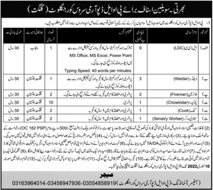 POL Depot Army Service Corps Juglot is subordinate of Pakistan Army invites applications from highly educated expert and experienced professionals for the post of LDC, Lower Division Clerk, Welder, Fireman, Chowkidar, Cook, Sanitary Worker in Juglot Gilgit Baltistan.