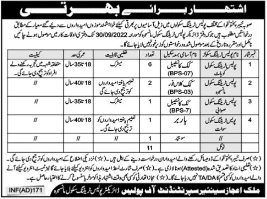 Police Training School invites applications for job positions advertised in daily Aaj dated 16 September 2022 for following vacancies in Mansehra, mansehra Khyber Pakhtunkhwa KPK Pakistan.