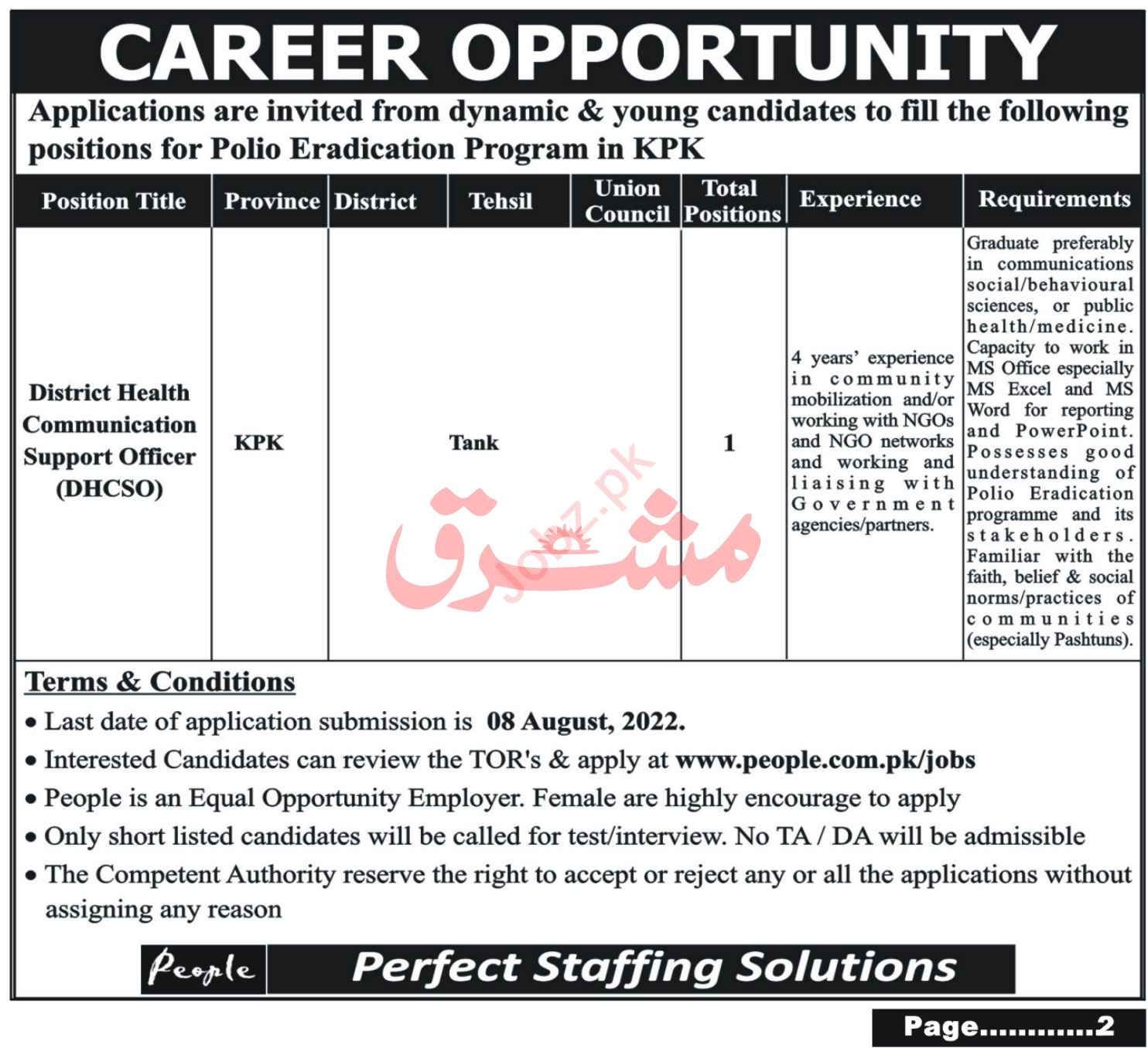 Pakistan Polio Eradication Programme is looking for candidates for following posts as per job advertisement published in daily Mashriq Newspaper of August 5, 2022 for location Tank, tank Khyber Pakhtunkhwa KPK Pakistan:
