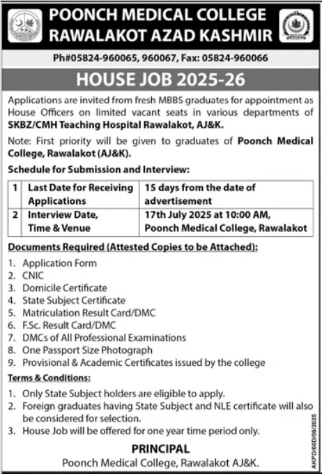 Poonch Medical College Rawalakot, rawalakot AJK Pakistan invites applications from eligible candidates for the post of house job trainees as per advertisement of June 27, 2025 published in daily Jang Newspaper. MBBS etc. educational qualification will be preferred.