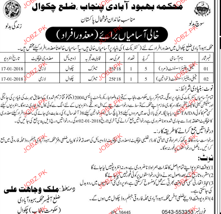 Latest Population Welfare Department Admin Clerical Posts Chakwal 2025