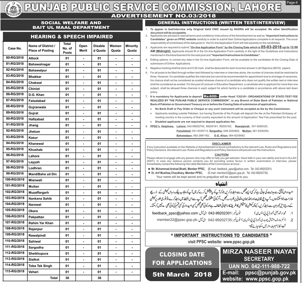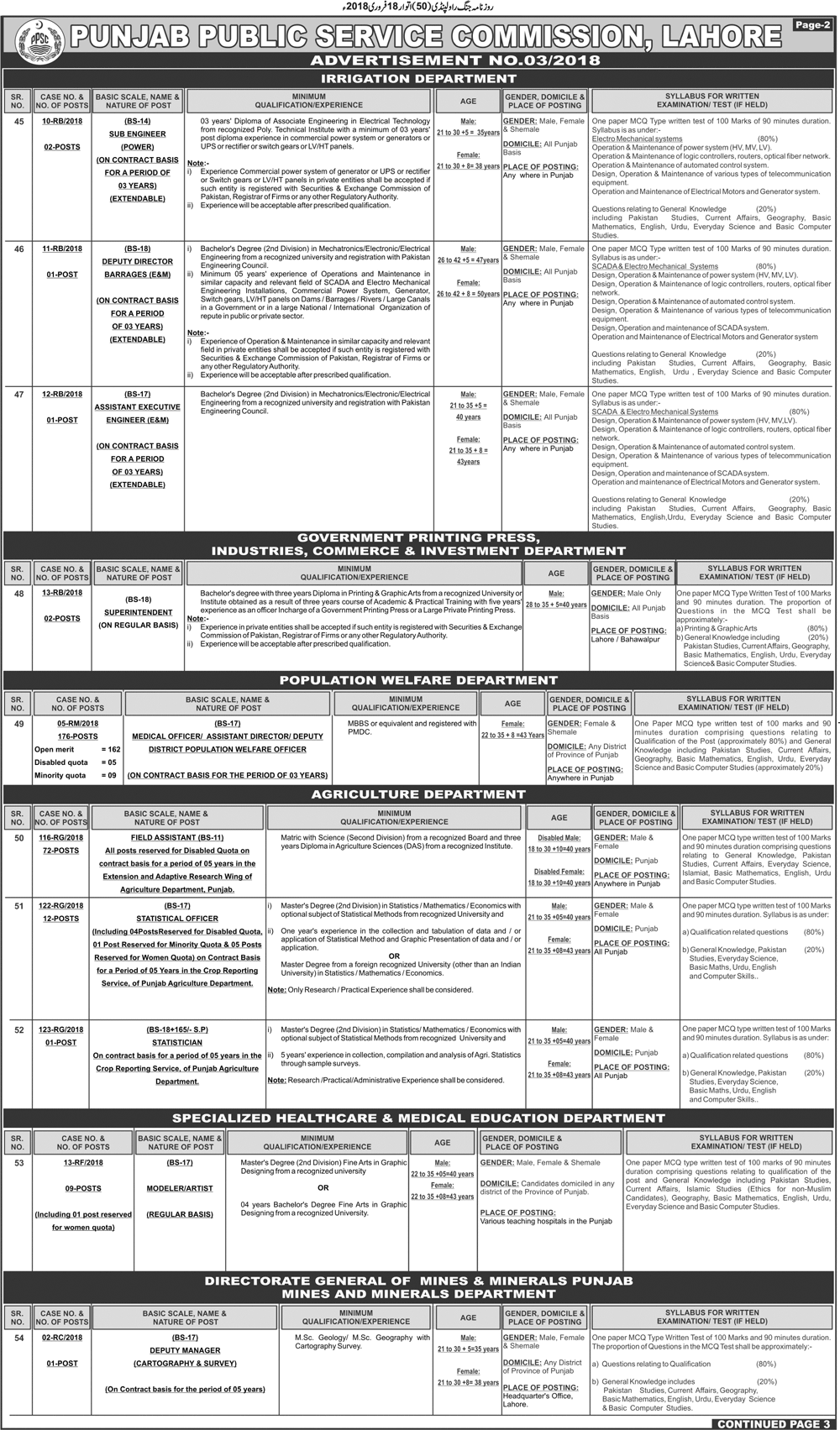 Medical Officer / Assistant Director / Deputy Director / Population Welfare Officers MBBS or equavlent and Registered with PMDC, Sub Engineers, Deputy Director, Assistant Executive Engineers in Irrigation Department, Superintendent BA in Government Printing Press Industries, Commerce & Investment Department, Field Assistants, Statistical Assistants, Statisticians in Agriculture Department, Modler / Artists in Specialized Healthcare & Medical Education Department, Deputy Manager in Directorate General of Mines & Minerals Punjab and Minerals Department Through Punjab Public Service Commission PPSC in Lahore