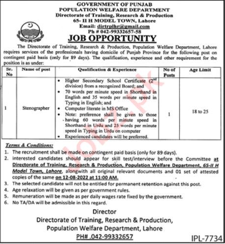 Population Welfare Department invites applications for job positions advertised in daily Jang dated 31 July 2022 for following vacancies in Lahore, lahore Punjab Pakistan.