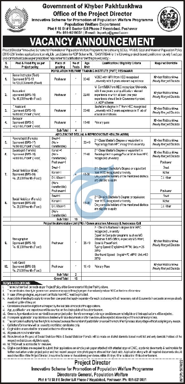 Vacant posts including accountant, assistant, social mobilizer, instructor, naib qasid, stenographer, sociologist, psychologist and sweeper are announced in Population Welfare Department Peshawar, peshawar Khyber Pakhtunkhwa KPK Pakistan as per 8 October 2022 advertisement in daily Aaj Newspaper. Candidates with Bachelor, Intermediate, Phd and Master etc. educational background will be preferred.