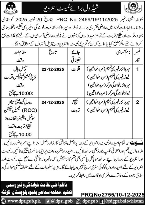 Population Welfare Department jobs advertisement dated about 11 December 2025 in daily Other Newspaper invites application for the vacant post of supervisor and tutor in Quetta, quetta Balochistan Pakistan. Preferred Education is Middle, Intermediate and Matric etc.