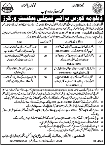Population Welfare Training Institute PWTI is offering admissions for paramedical diploma and courses in Family Welfare Workers in Lahore, Sheikhupura, Kasur, Gujrat, Gujranwala, Narowal, Sialkot, Rawalpindi, Attock, Jhelum, Nankana Sahib, Multan, Rajanpur, Muzaffargarh, Bahawalpur, Lodhran, DG Khan, Khanewal, Rahim Yar Khan, Layyah, Sahiwal, Pakpattan, Jhang, Okara, Bahawanagar, Vehari, Hafizabad, Faisalabad, Mianwali, Sargodha, Toba Tek Singh, Chiniot, Bhakkar, Khushab, Mandi Bahauddin, Chakwal. Read newspaper ad for exact details.