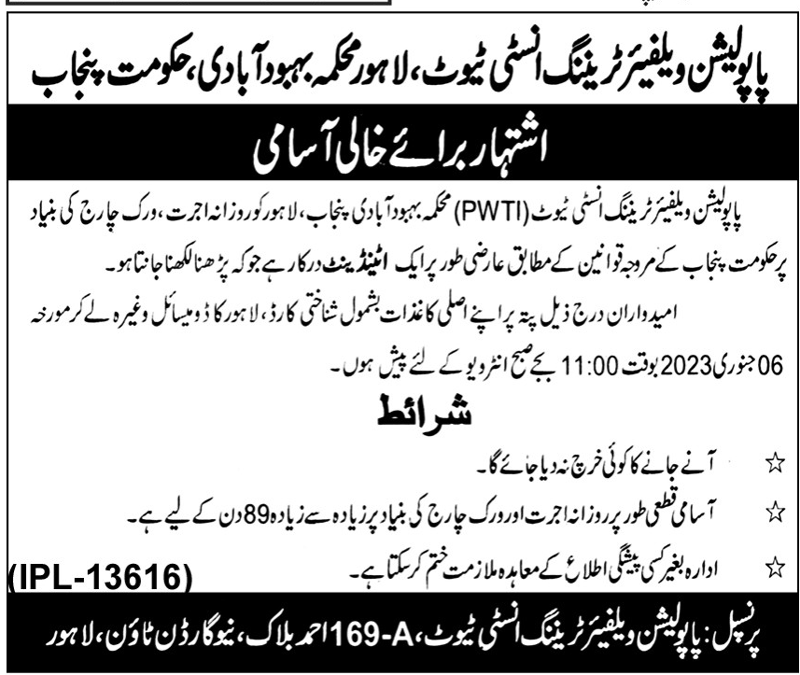 Latest Population Welfare Training Institute PWTI Labor Posts Lahore 2025