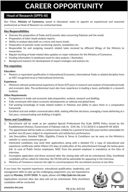 Vacant posts including head of research are announced in Human Resource Solutions International HRSI Islamabad, islamabad Islamabad Pakistan as per 1 July 2024 advertisement in daily Jang Newspaper. Educational qualifications required Bachelor, Master and MS etc.