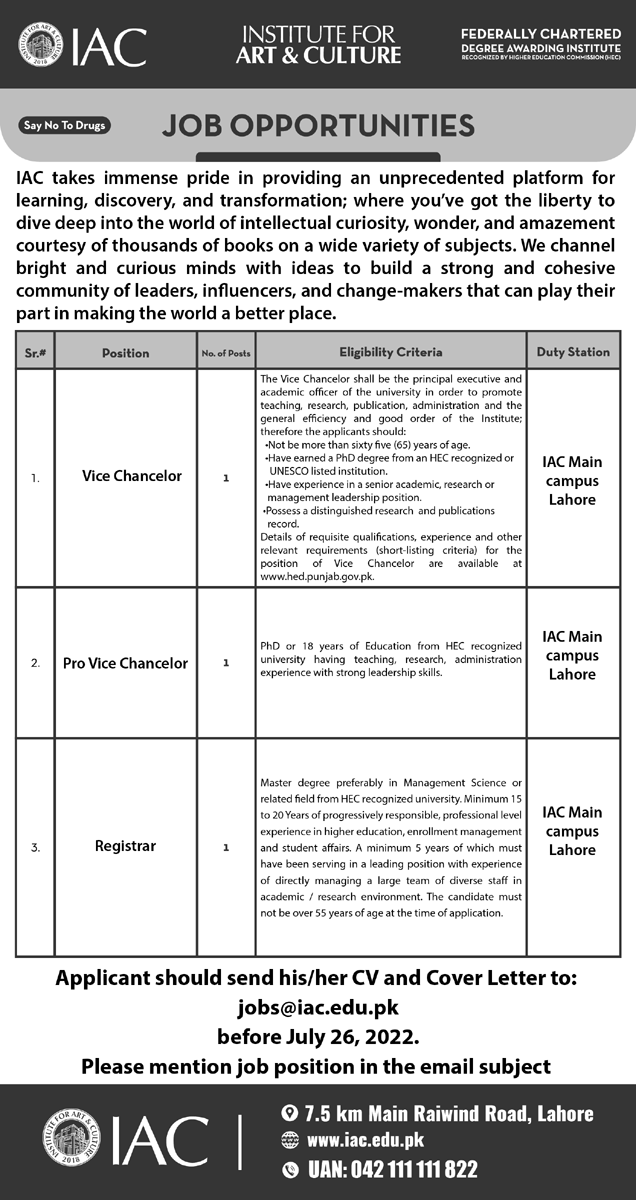 Institute of Art & Culture IAC jobs advertisement dated about 17 July 2022 in daily Nawaiwaqt Newspaper invites application for the vacant post of pro vice chancellor, vice chancellor and registrar in Lahore, lahore Punjab Pakistan. Persons with Bachelor, Mphil, M.sc, Phd, MA and Master etc. education can apply.