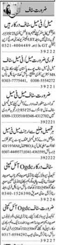 Private Company jobs advertisement dated about 3 September 2022 in daily Dunya Newspaper invites application for the vacant post of male staff, accountant, security supervisor, manager, retired staff, call operator, helper, clerk and female staff in Lahore, lahore Punjab Pakistan. Persons with Intermediate, Matric, Middle and Bachelor etc. education can apply.