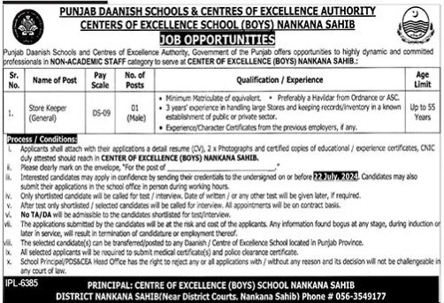 Punjab Daanish Schools & Center Of Excellence Authority Nankana Sahib, nankana sahib Punjab Pakistan invites applications from eligible candidates for the post of store keeper as per advertisement of July 5, 2024 published in daily The News Newspaper. Preferred Education is Matric etc.