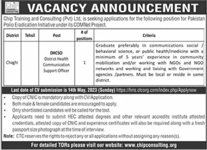 CHIP Training & Consulting Pvt Ltd invites applications for job positions advertised in daily Jang dated 9 May 2023 for following vacancies in Chaghi, chaghi Balochistan Pakistan.